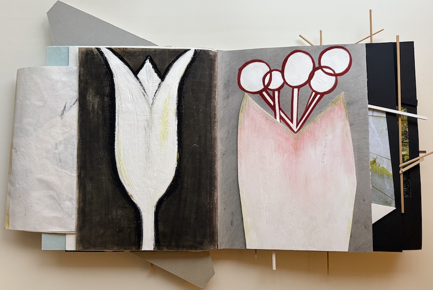 ここ10年以上取り組んでいるブックアートは、自作の40ページの大版ノートブックに、ドローイングやコラージュを施したものです。